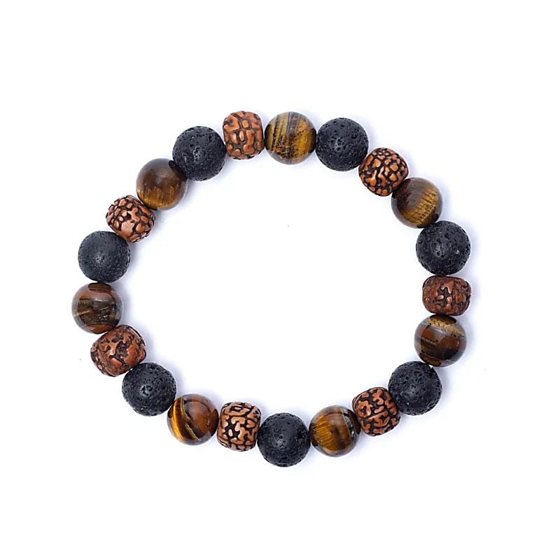 Elastische armband bestaande uit rudrakshazaden, tijgeroog en lavasteen.