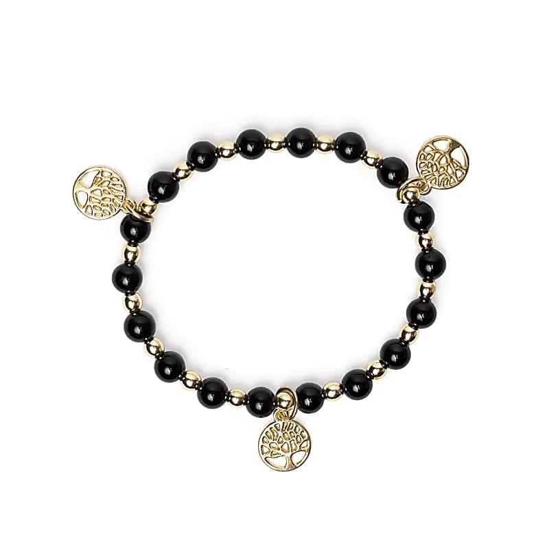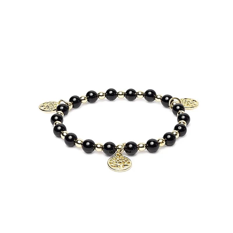Een casual-chic edelsteenarmband van zwarte toermalijn en hematiet met een Levensboom-bedel en kwastje.