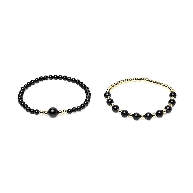 Een set van twee elastische edelsteenarmbanden van zwarte toermalijn en hematiet.