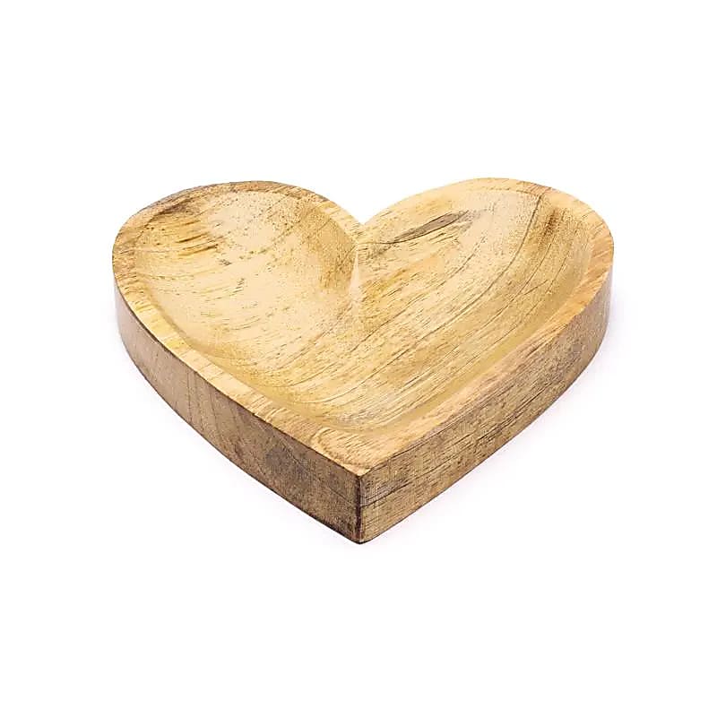 Een hartvormig bakje van massief mangohout, geschikt voor het bewaren van sieraden, kristallen of andere kleine voorwerpen.
