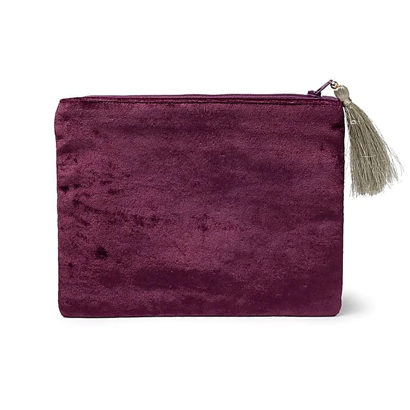 De zachte fluwelen textuur en het decoratieve kwastje aan de rits voegen een vleugje luxe toe aan praktische opbergruimte.