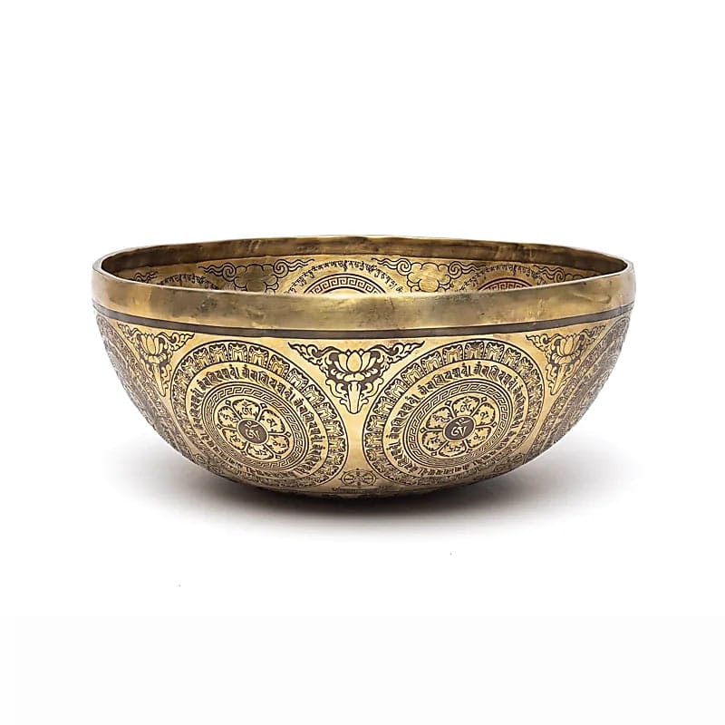 De voorspoedbrengende symbolen rondom haar versterken thema’s als welzijn, bescherming en spirituele voeding, waardoor deze klankschaal bijzonder geschikt is voor beoefening gericht op heling, kalme aandacht en herstellend klankwerk.
