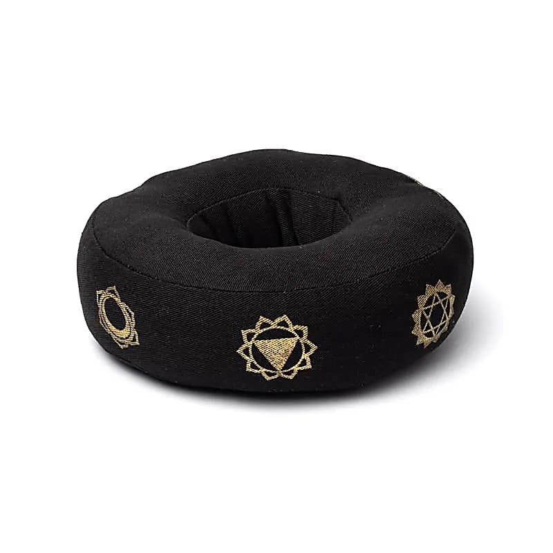 Gevoerd katoenen klankschaalkussen met goudkleurige chakra-symbolen.