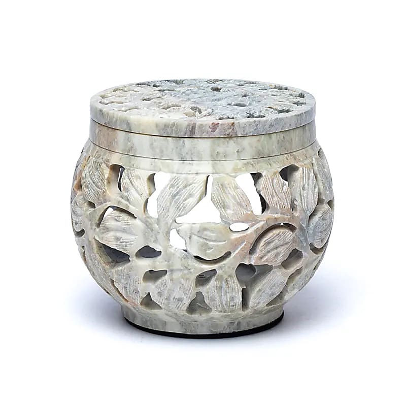 Met het zeepstenen deksel is het de ideale brander voor dhoop cones, waarbij de rook op sierlijke wijze door de gaatjes in het deksel tevoorschijn komt.