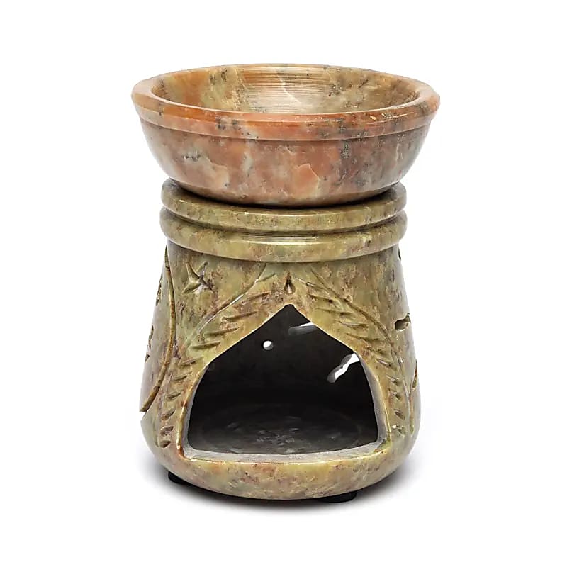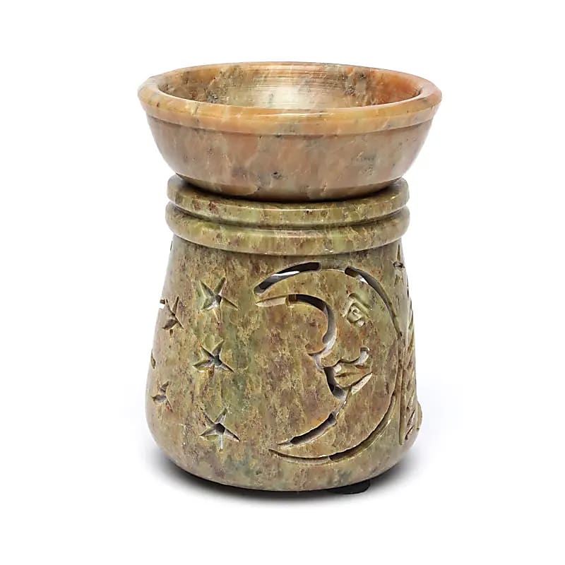 Olieverdamper van natuurlijke zeepsteen met een opengewerkt zon- en maanmotief.