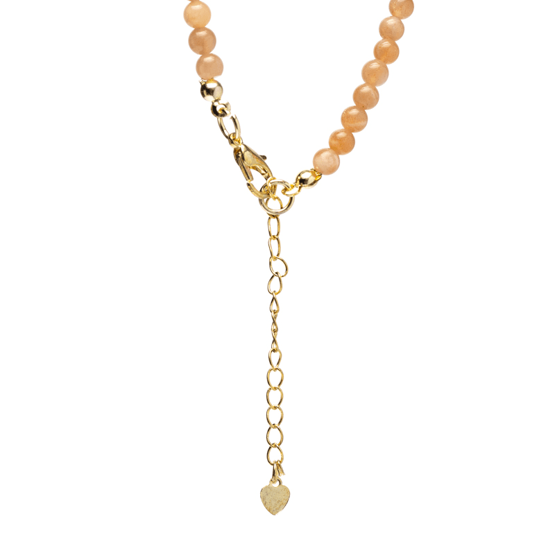 Een verfijnde edelstenen halsketting met gepolijste kralen van 3 mm en een goudkleurige maan hanger, symbool voor intuïtie, emotionele balans en vrouwelijke energie.