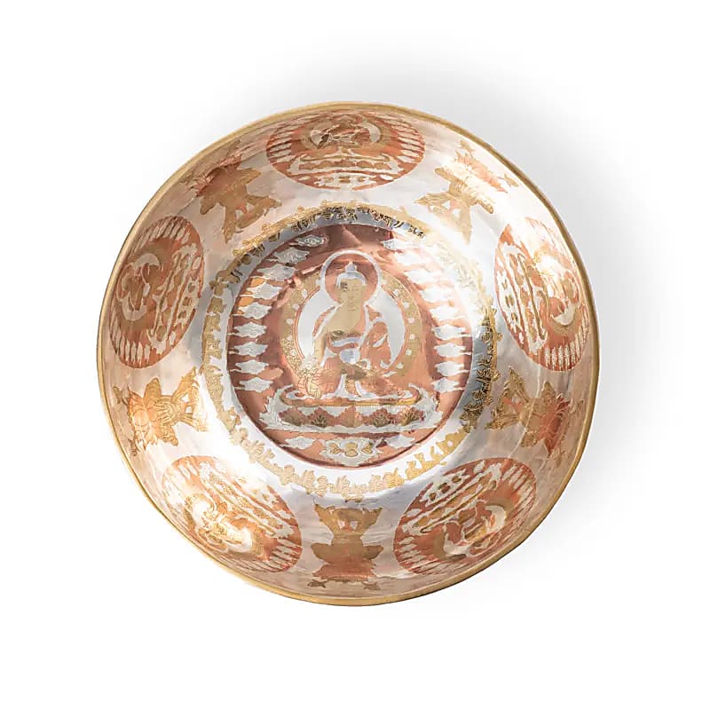 Galvanisch verzilverde, sierlijke klankschaal, met gegraveerde afbeeldingen van de Medicijnboeddha en de vijf Dhyani Boeddha’s. De schaal is verder gedecoreerd met voorspoed brengende symbolen zoals de dubbele dorje, lotus en oneindige knoop, als ook de mantra van compassie ‘Om Mani Pad Me Hum’.