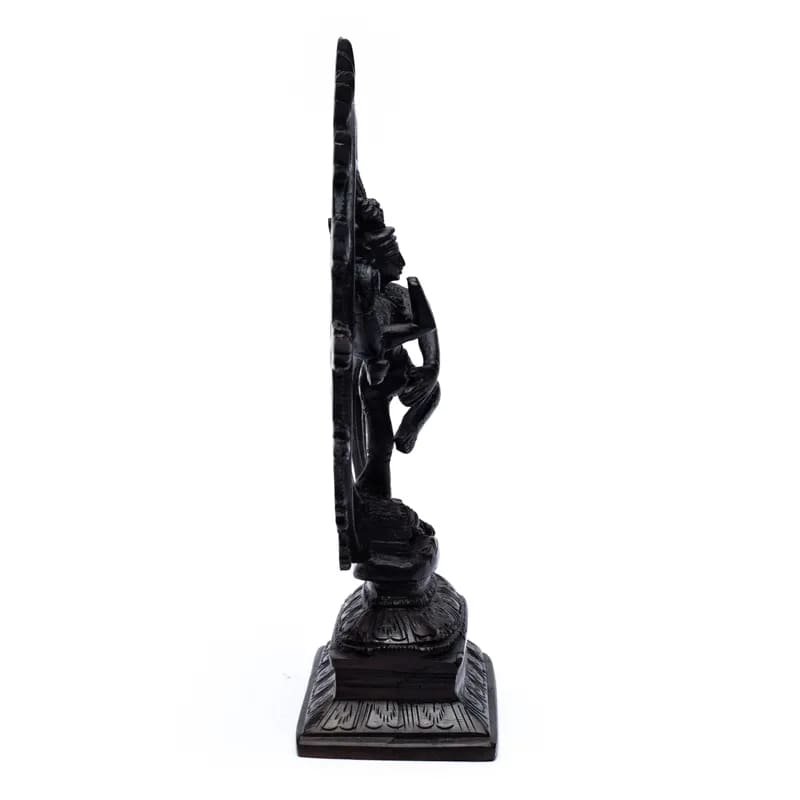 Met een linkerhand houdt Shiva een fakkel of vlam vast als symbool van vernietiging en vernieuwing.