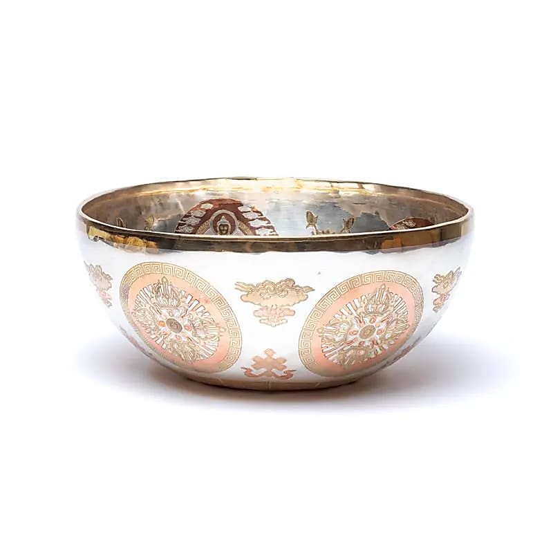 Galvanisch verzilverde, sierlijke klankschaal, met gegraveerde afbeeldingen van de Medicijnboeddha en de vijf Dhyani Boeddha’s. De schaal is verder gedecoreerd met voorspoed brengende symbolen zoals de dubbele dorje, lotus en oneindige knoop, als ook de mantra van compassie ‘Om Mani Pad Me Hum’.